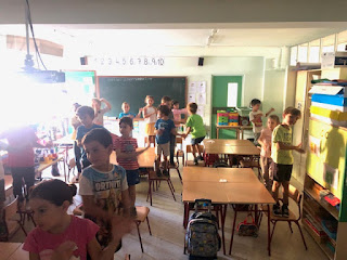 Hoy los niños de tercer curso se han portado de forma e j e m p l a r , hemos hecho presentaciones, descrito lugares usando el there is y t...